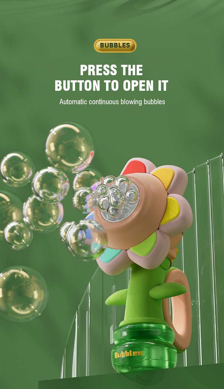- Enchanting Flower Design, Dazzling LED Lights, and Dancing Action: With its flower-shaped design and mesmerizing LED lights, this bubble gun brings bubbles to life with a whimsical, dance-like motion. Whether under the sun or the stars, kids will be captivated by the magical experience that this bubble-blasting wonder provides!