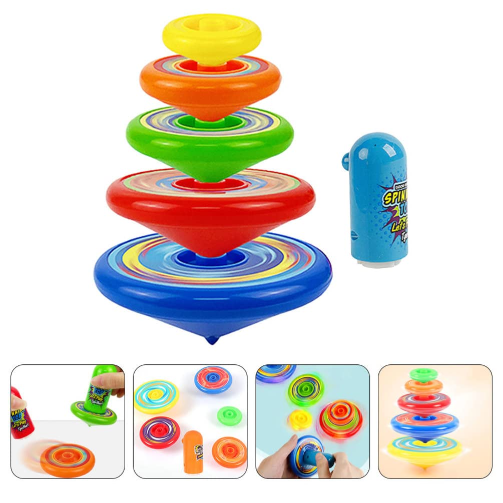 - VIBRANT SPINNING FUN: Elevate playtime with 1 sets (5 pieces) of colorful spinning tops! Stack them into a towering kaleidoscope or enjoy individually for endless entertainment.